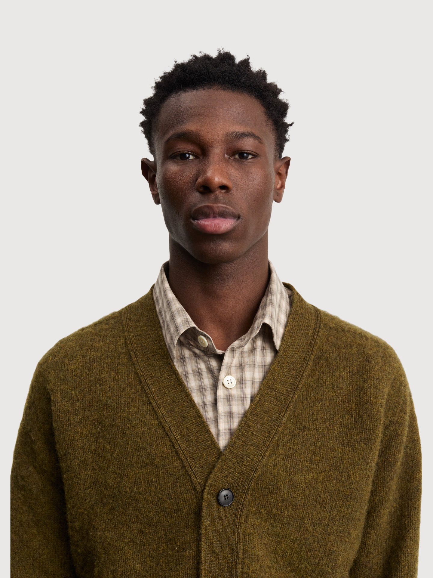 Another Cardigan 1.0 in dark olive by Another Aspect is crafted in the Scottish Borders by expert knitters from 100% wool. The brushed finish, relaxed shape and ribbed trims bring soft structure to this everyday layer, while mother of pearl buttons add a refined touch. A warm, timeless knit designed for effortless wear.