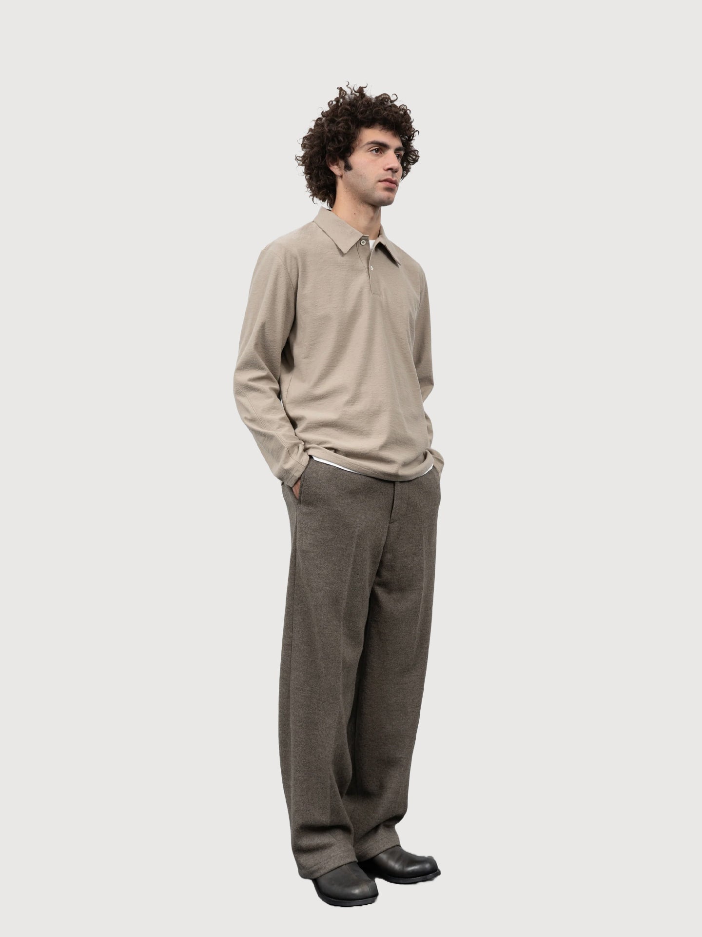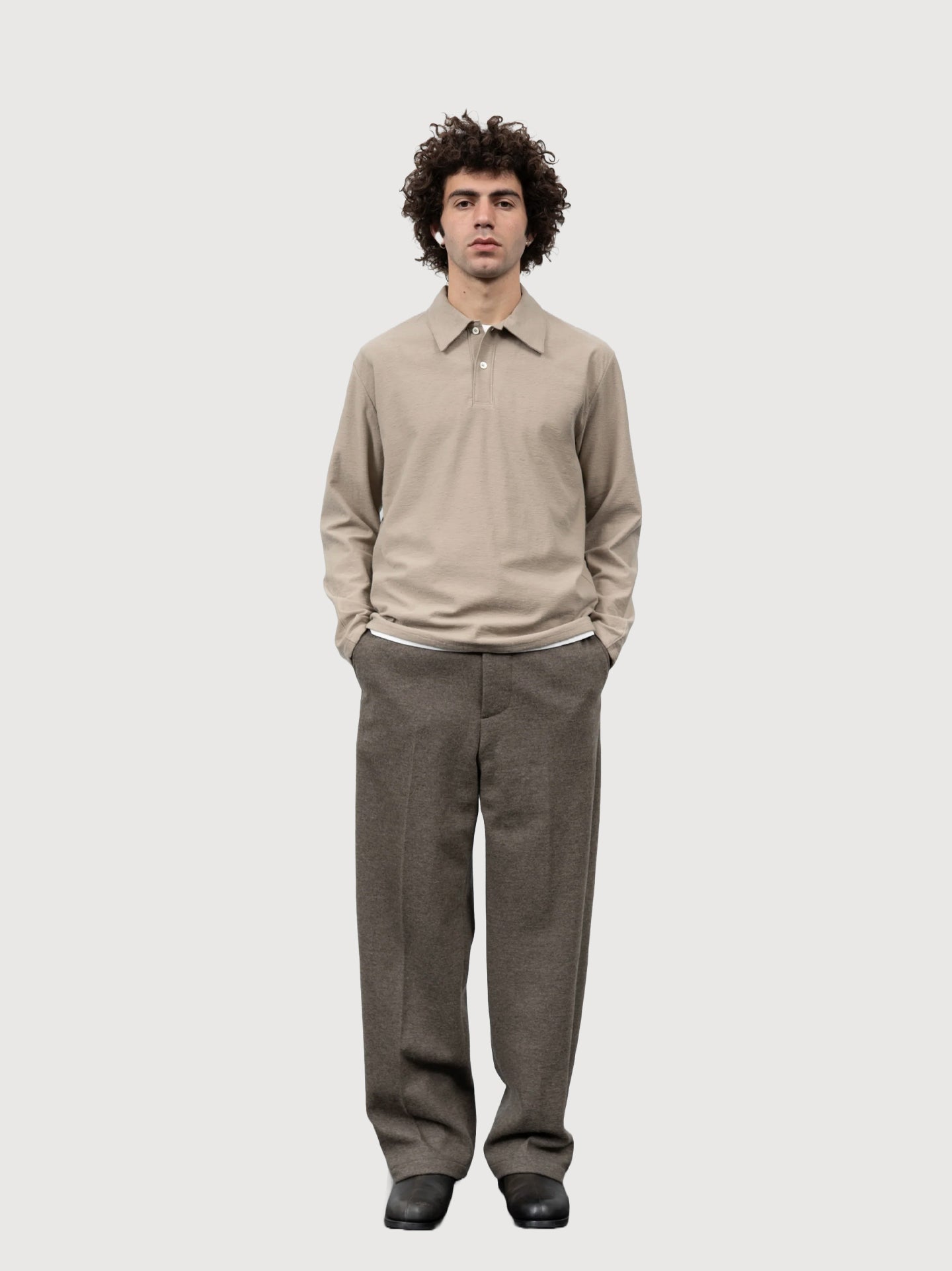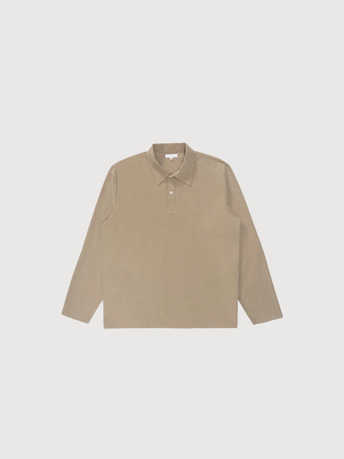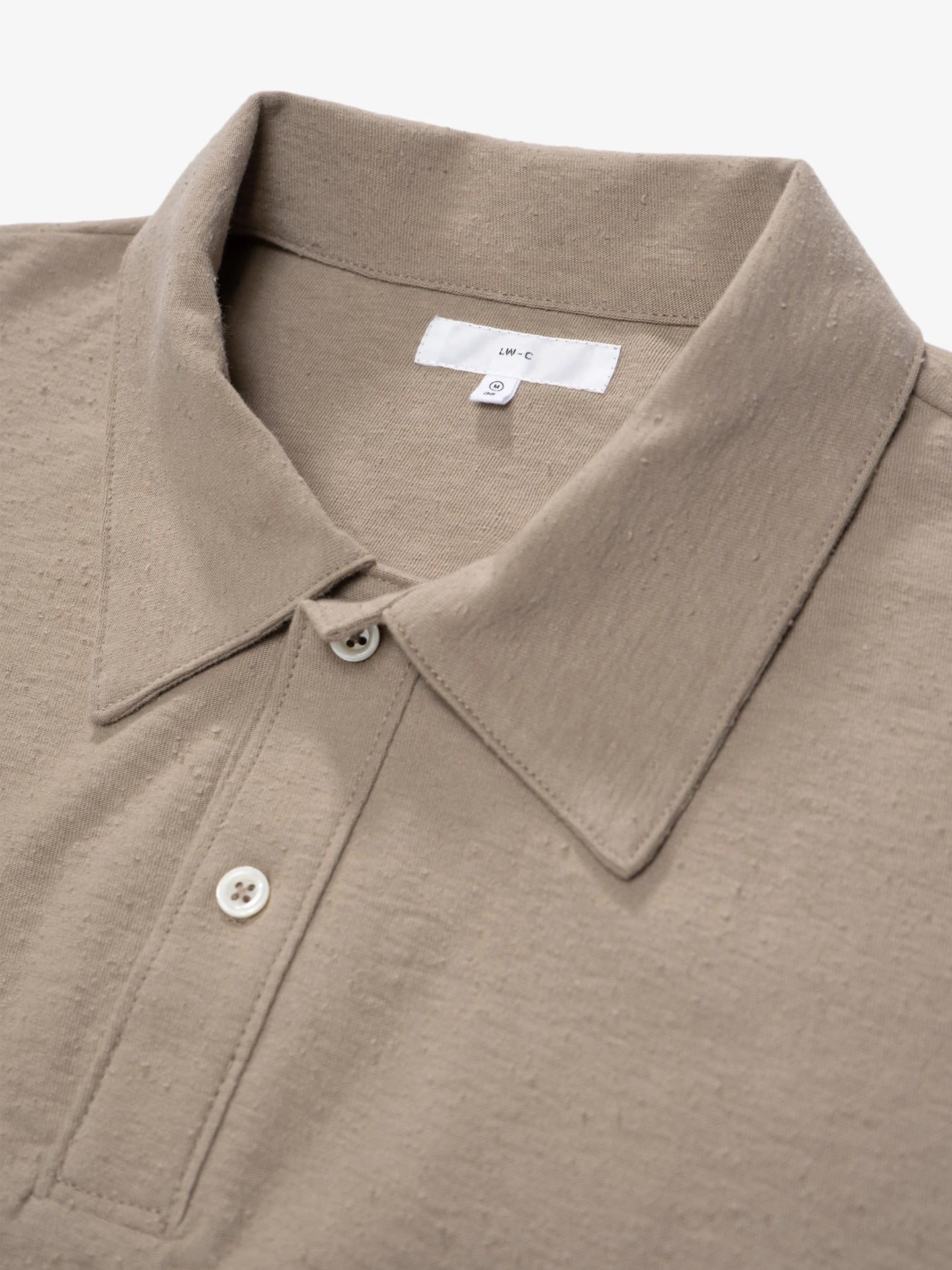 Lady White Co. Nep Polo in Sand made from Japanese nep jersey. Relaxed cut, elbow patch, flat hem and mother of pearl buttons.