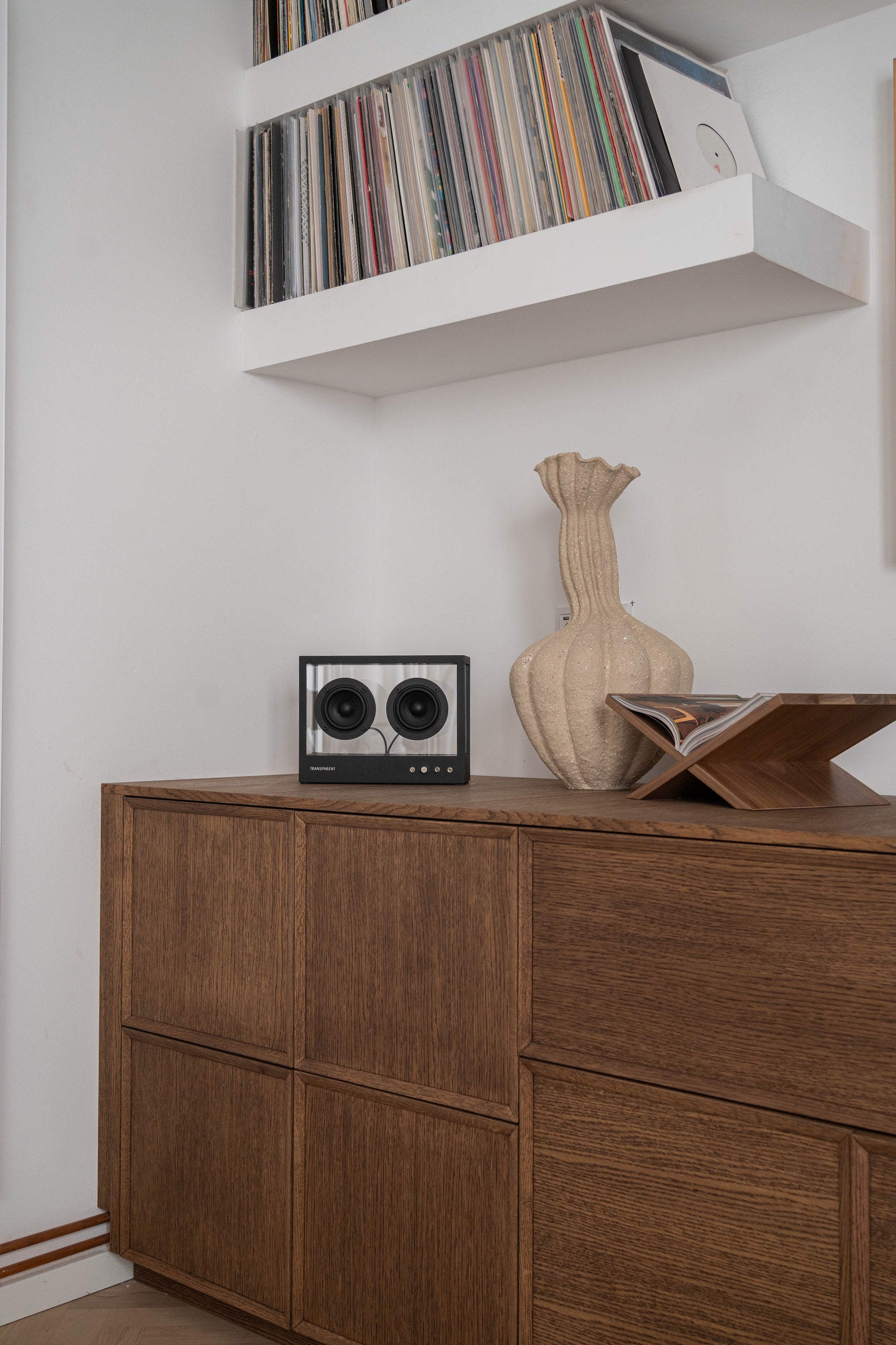 The Small Transparent Speaker in black combines minimalist Scandinavian design with rich, transparent sound. Built from aluminium and tempered glass, it offers Bluetooth 5.0 connectivity, True Wireless pairing, and advanced DSP tuning in a compact, future-ready form made to last.