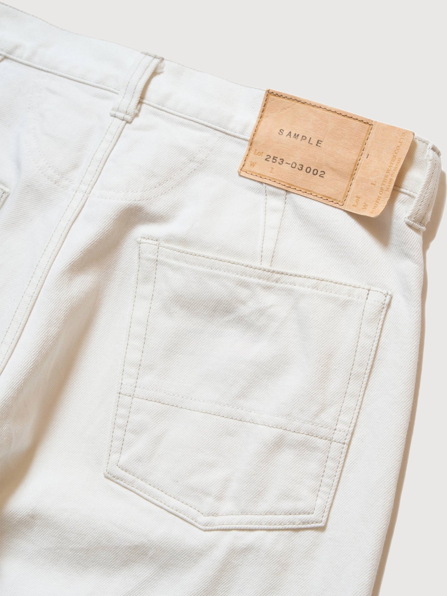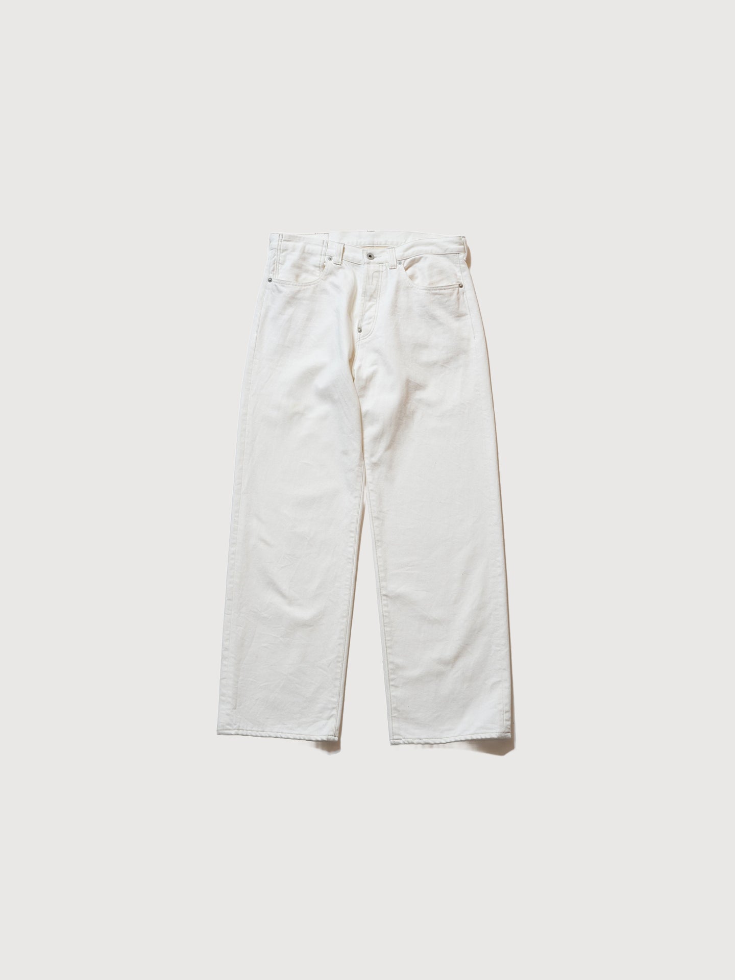The White Denim Pants in White are crafted in Japan from 100% cotton, with every stage, from spinning and weaving to sewing, completed domestically in Okayama. Based on the structure of vintage Levi’s 501s, the design reinterprets a denim classic through collaborative craftsmanship. The stitching method intentionally combines natural upper threads with navy lower threads, allowing each sewer’s movements to determine the visible color shifts on the surface. This approach creates subtle variations in every pair, embedding the individuality of the maker into the garment. With its straight cut, durable fabric, and quiet irregularities, this denim expresses Japanese attention to detail and the spirit of collective making.