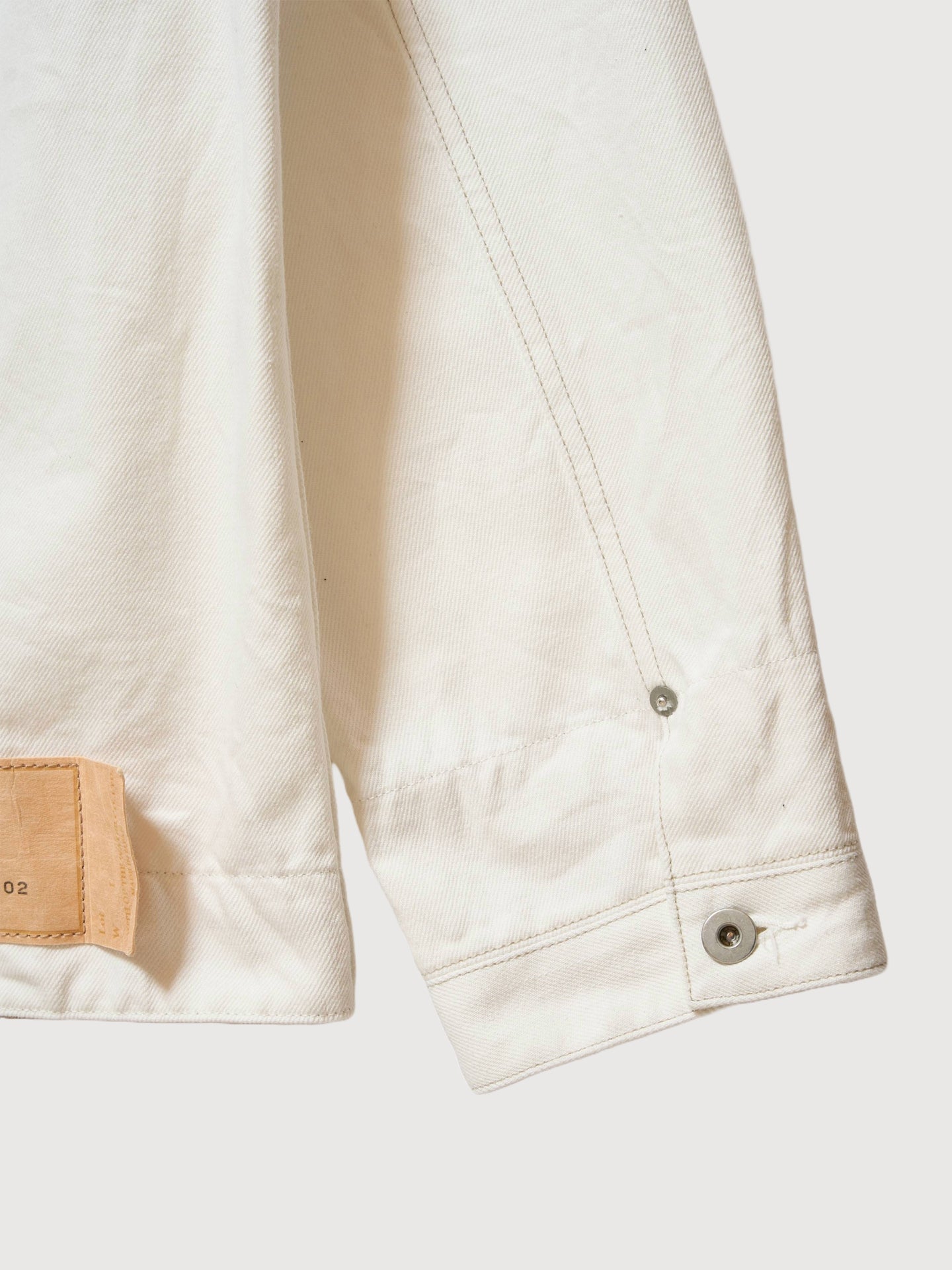 This white denim pullover is crafted in Japan from 100% cotton, with every stage, from spinning and weaving to sewing, completed domestically. Made in Okayama, it features deliberately mismatched upper and lower thread colors, allowing each artisan’s stitching to leave a unique trace. Every seam becomes a subtle signature, creating a piece defined by material integrity and human craftsmanship.